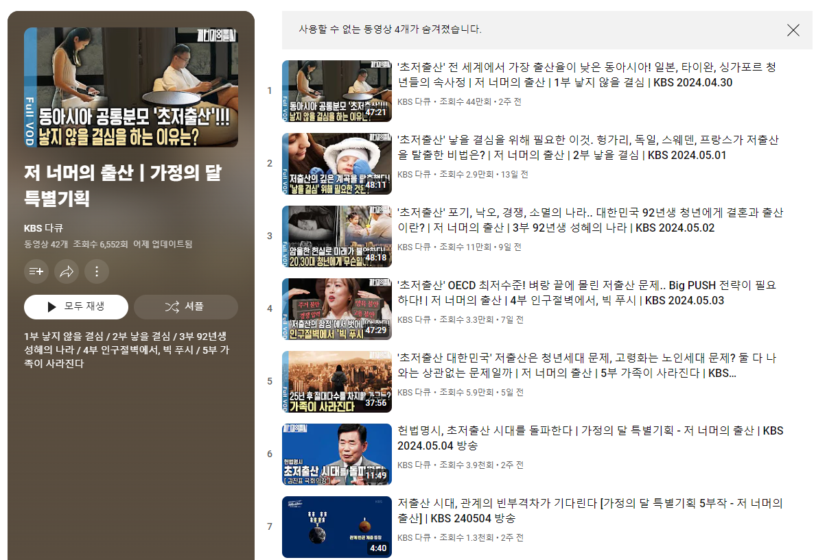 최근에 방영한 저출산 관련 다큐멘터리입니다. 총 5부로 이루어져 있으며 홈페이지에서 다시보기 할 수 있습니다.